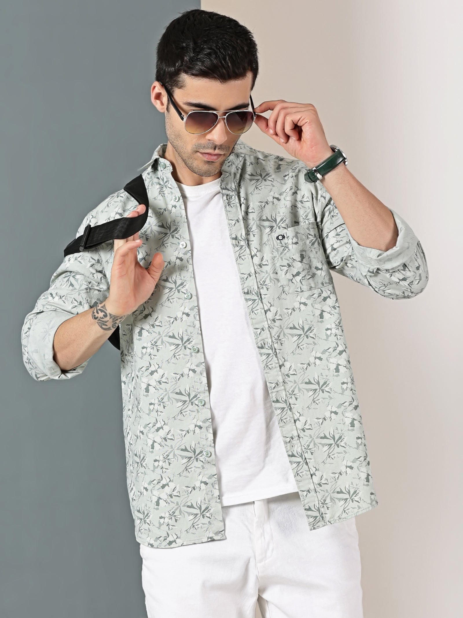 Refresh your wardrobe with the Seafoam Botanical Dobby Shirt, a cool, coastal take on print. The layered leaf and bloom motifs sit on a lightweight cotton dobby base that breathes beautifully in heat. Finished soft and easy to wear, this shirt moves from brunch to evening plans with minimal effort.